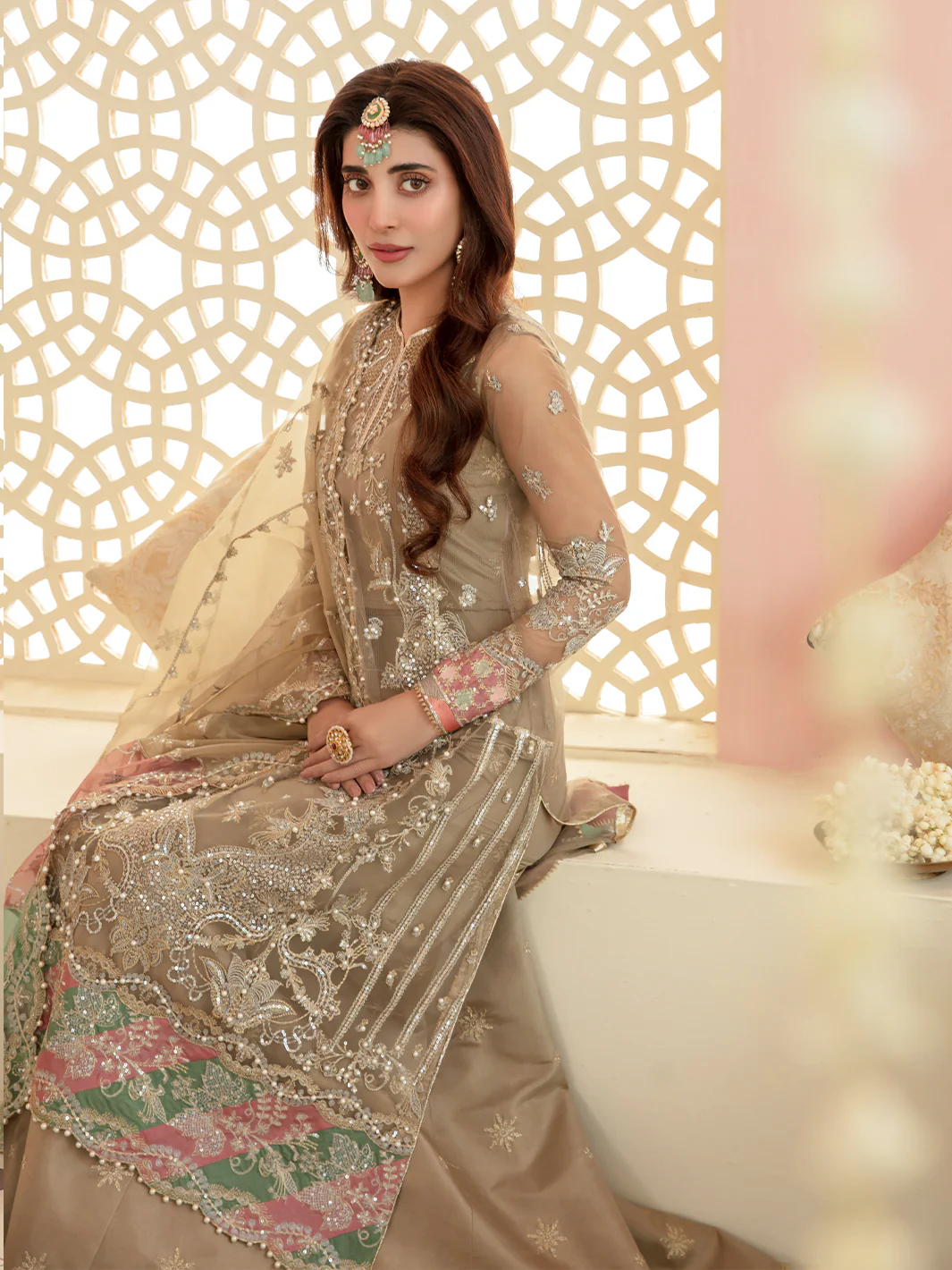Sequence Embroidered Front Side Kalian Left Right with Pearl Work on Dyed Net
